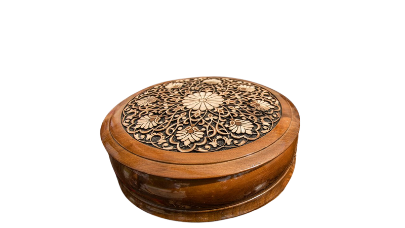 A round wooden box with delicate floral carvings, ideal for decor or personal storage.